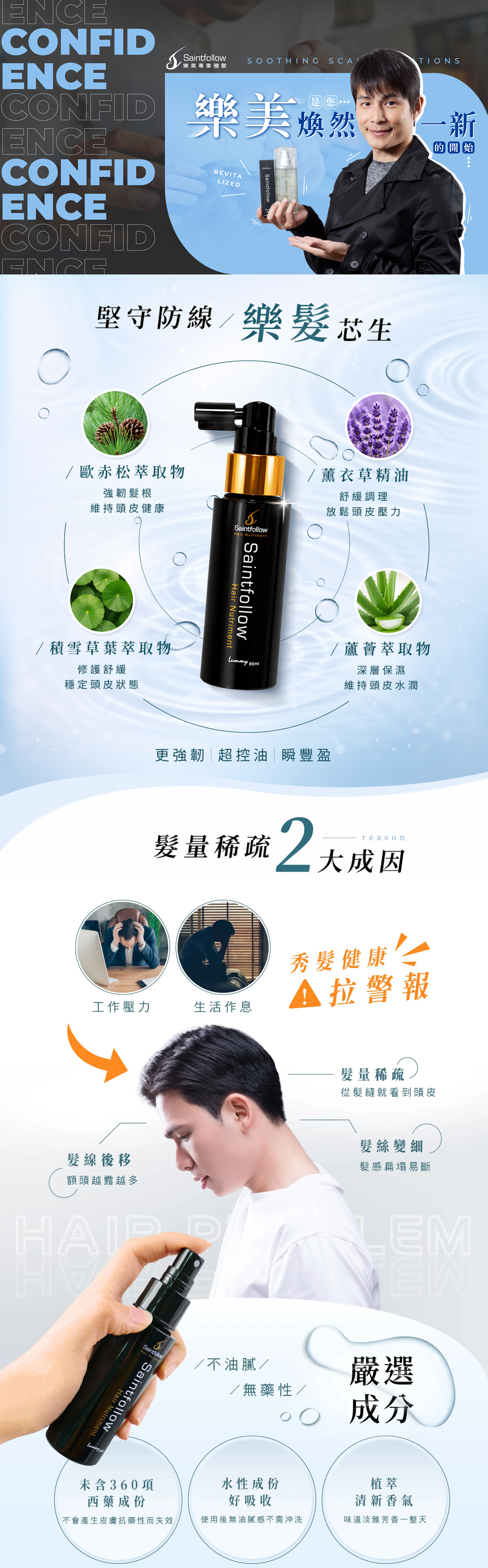 撥開髮絲輕壓噴頭>直接將滋養液>噴在髮根/頭皮上>静待3分鐘自然風乾即可 3 無需特別按摩,如有流下滋養液可用指腹往頭頂抹去