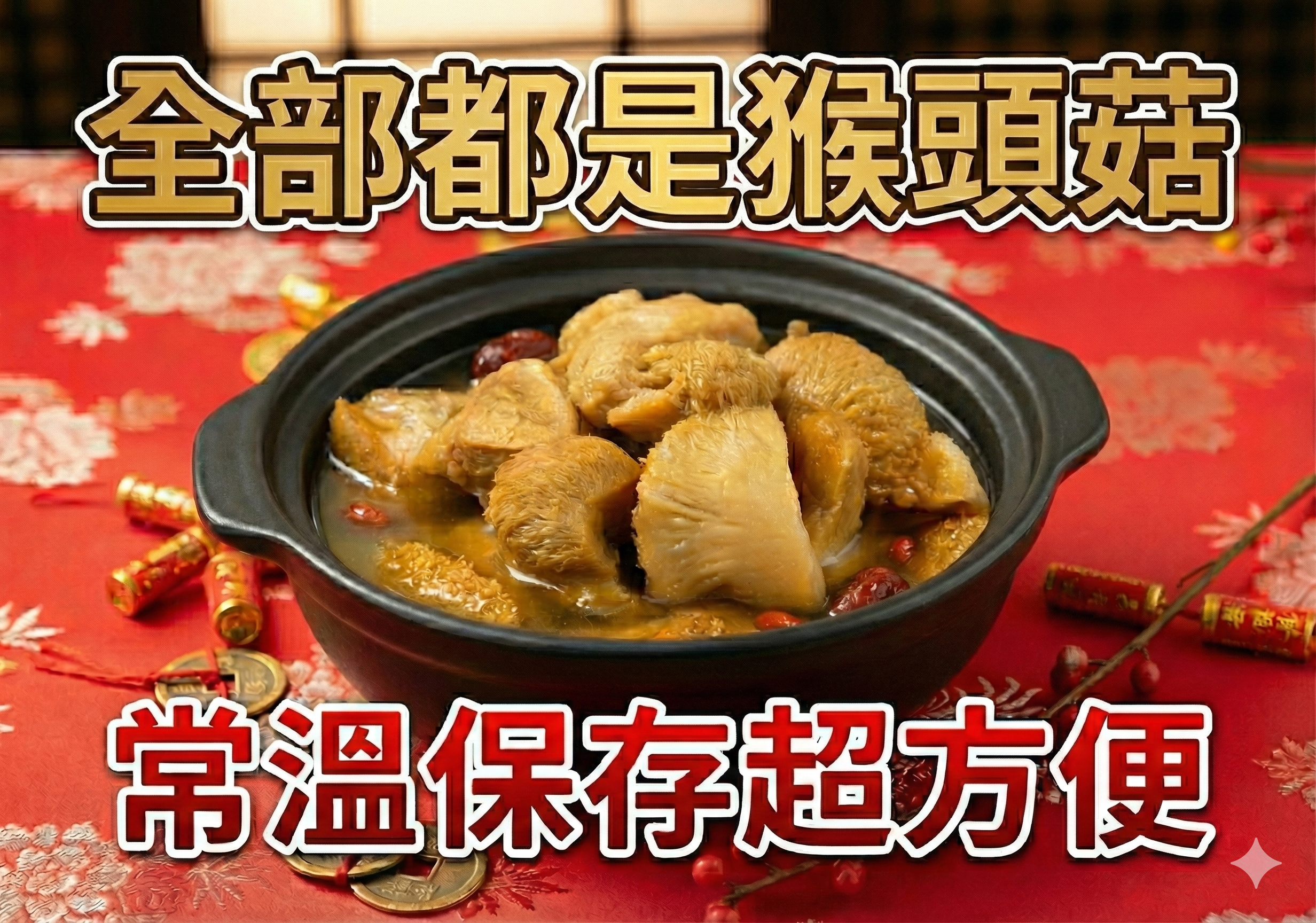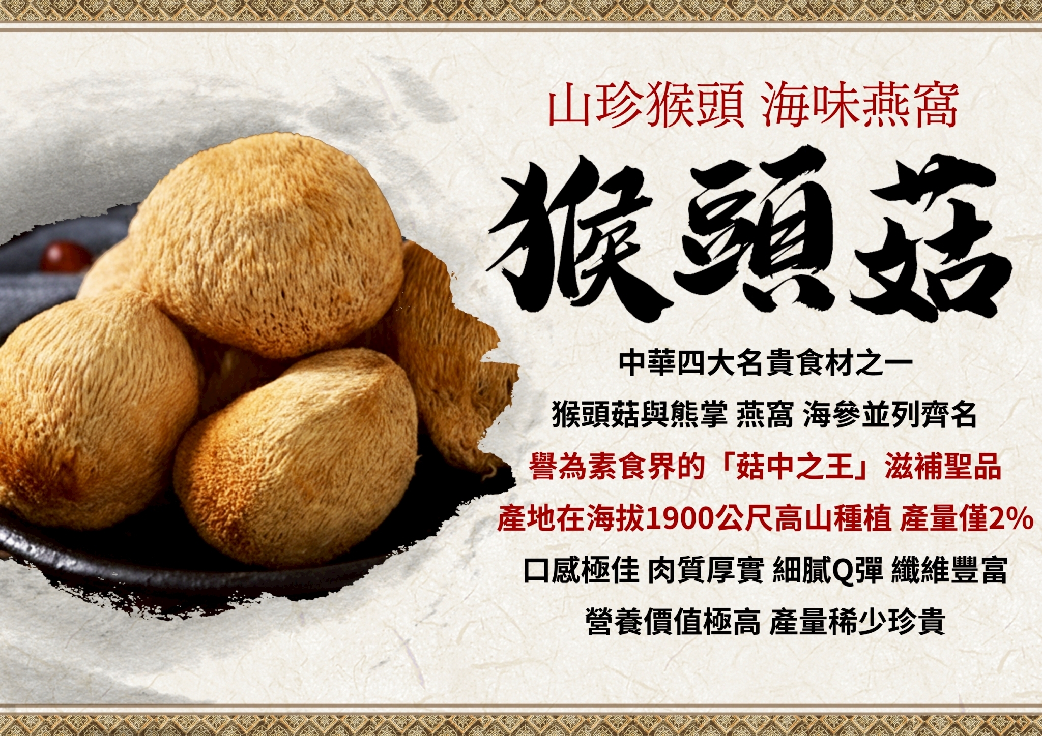 嚴選百分之百猴頭菇,中華四大名貴食材之一,素食界譽為「菇中之王」,