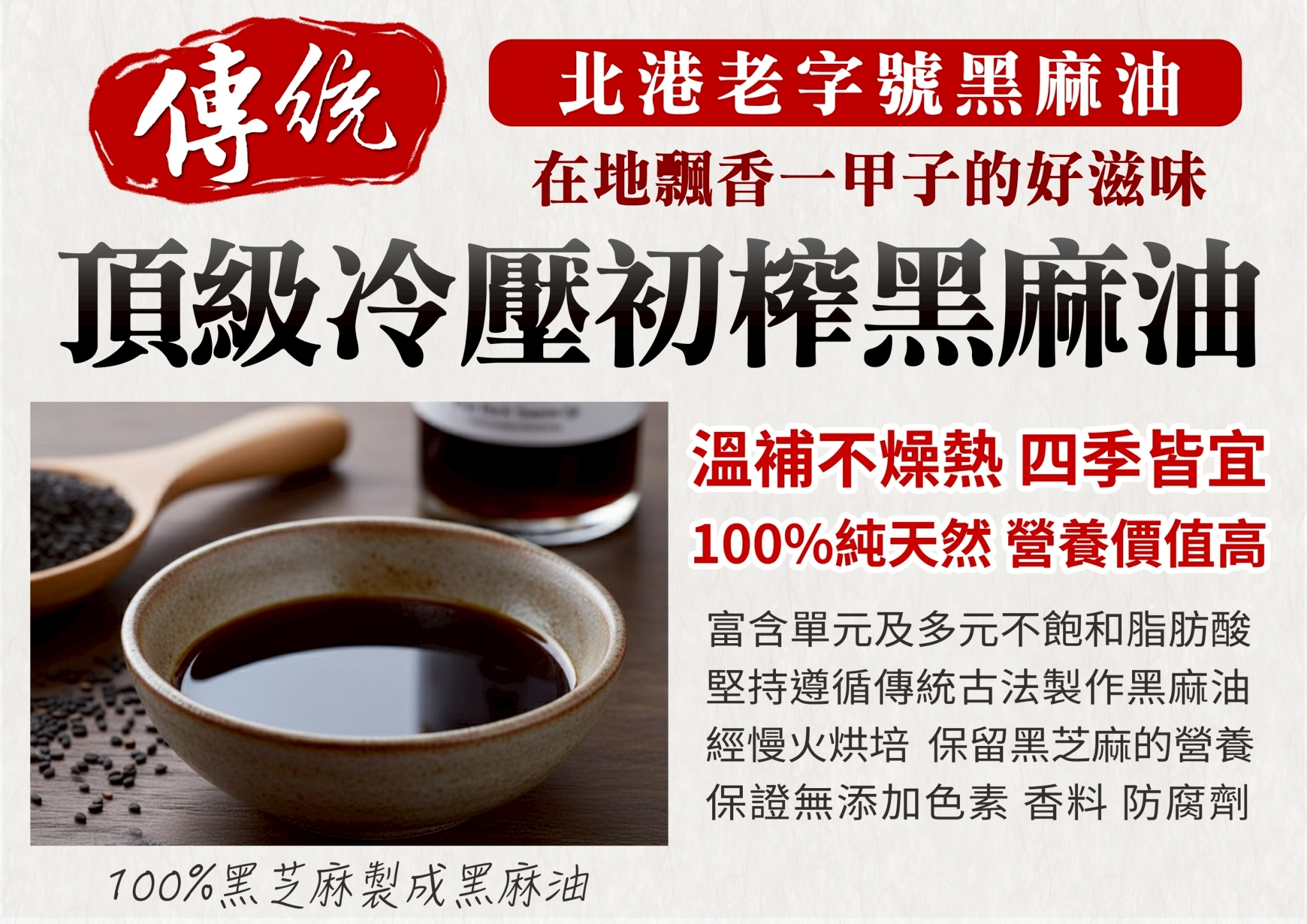 採用 100% 純黑芝麻低溫冷壓製成,保留完整營養,香氣濃郁、營養價值更升級。