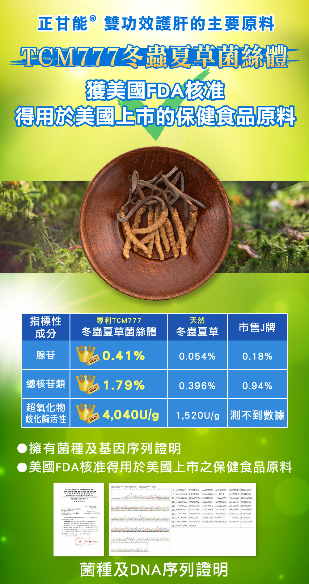 ▶ 正甘能®膠囊專利TCM777菌絲體活性成分含量高