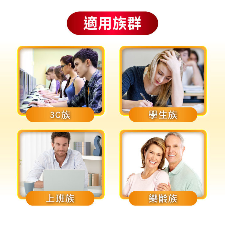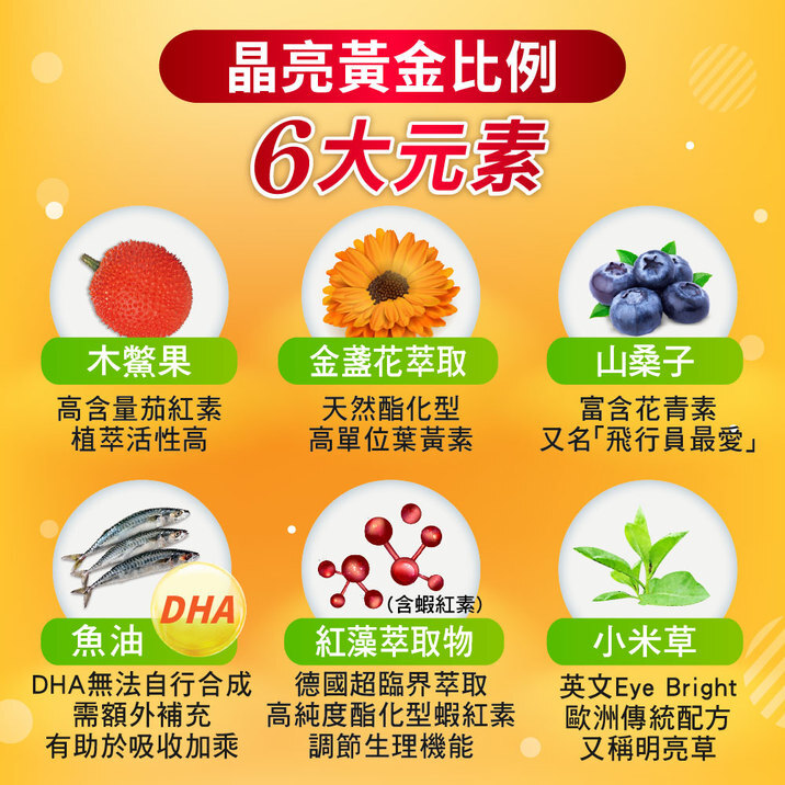 金盞花萃取物(含脂化型葉黃素及玉米黃素)、魚油(含DHA)、木鱉果萃取物、小米草(明亮草)萃取物、硒酵母、葡萄糖酸鋅、山桑子萃取物、生育醇(維生素E)、紅藻萃取物(含蝦紅素)、維生素A棕櫚鹽(維生素A) 膠囊殼:明膠、甘油、純水、二氧化鈦、食用紅色40號、食用黃色5號 |